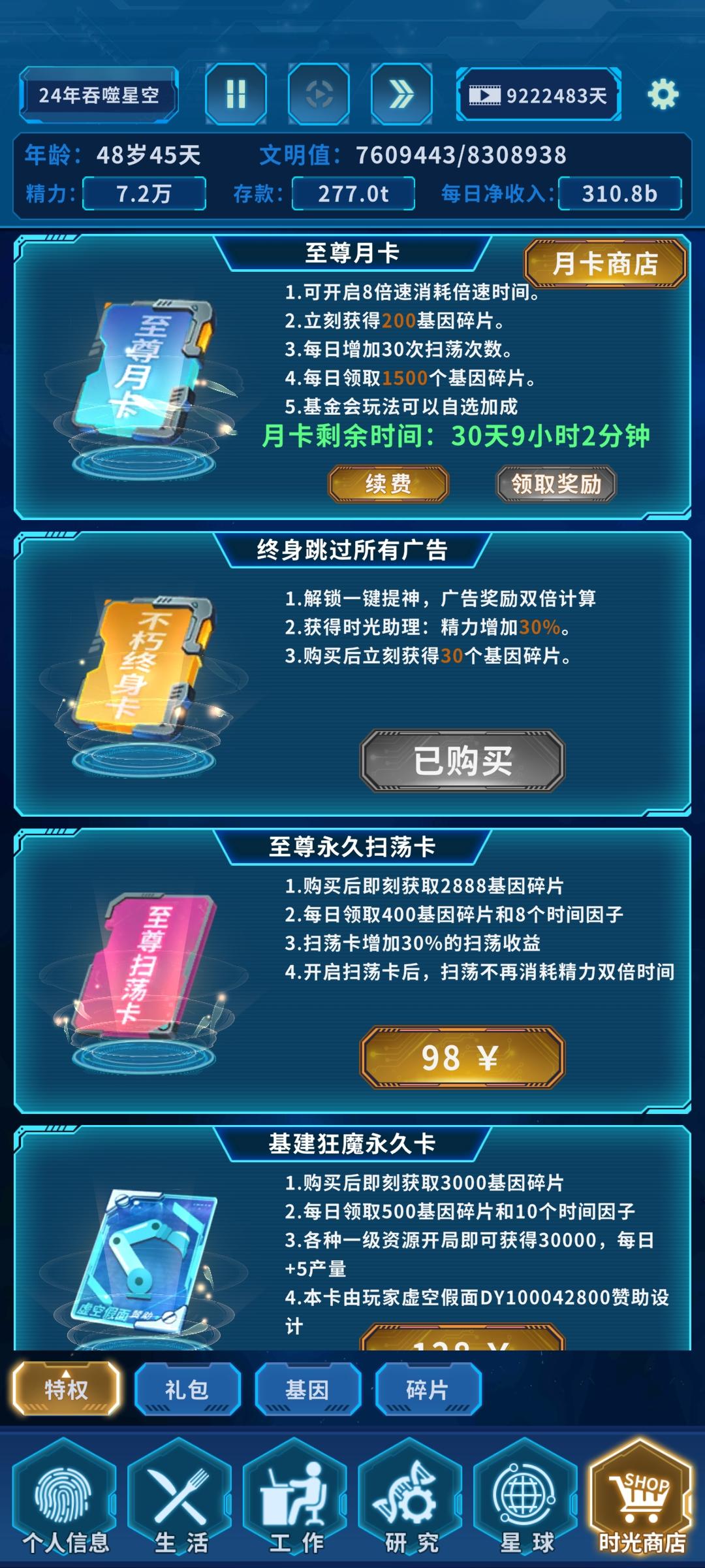 全篇攻略都在讲氪金方案,0氪慎入共分为5档一、微微氪作为微微氪,首选考虑性价比,全游戏最有性价比的氪金点是不朽终身卡。不朽终身卡作为18r的永久卡,解锁了一件提神功能和一个永久的25%精力助理,除此之外可以跳过广告以及冷却时间获得双倍倍速和精力加成,重点可以每天嫖39-45不等的基因碎片(三轮基因碎片广告),有了终身卡,情缘满级指日可待。其次最有性价比的是个人信息右上角的1元礼包以及6r