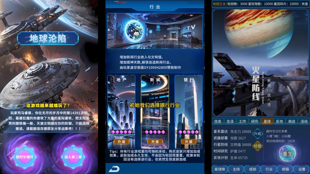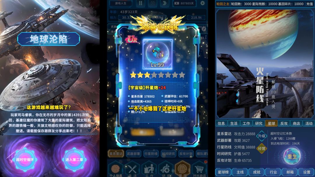 最近我轮回了1400多次 终于击败天狼文明进入第二章 说出来你可能不信 给你们看看第一章地球沦陷记录 游戏初期一定要选择基建行业 因为做个基建狂魔可以敛取更多金钱 为后面部署武器做保障 轮回越多升级越快 每当年龄达到一定岁数 外形舰队就会入侵地球 我们必须提前部署好武器 然后找到属于自己的属性搭配 进行改造升级 一举消灭他们#宝藏游戏安利派对#游戏安利#游戏推荐#游戏讨论#游戏资讯#宝藏厂商