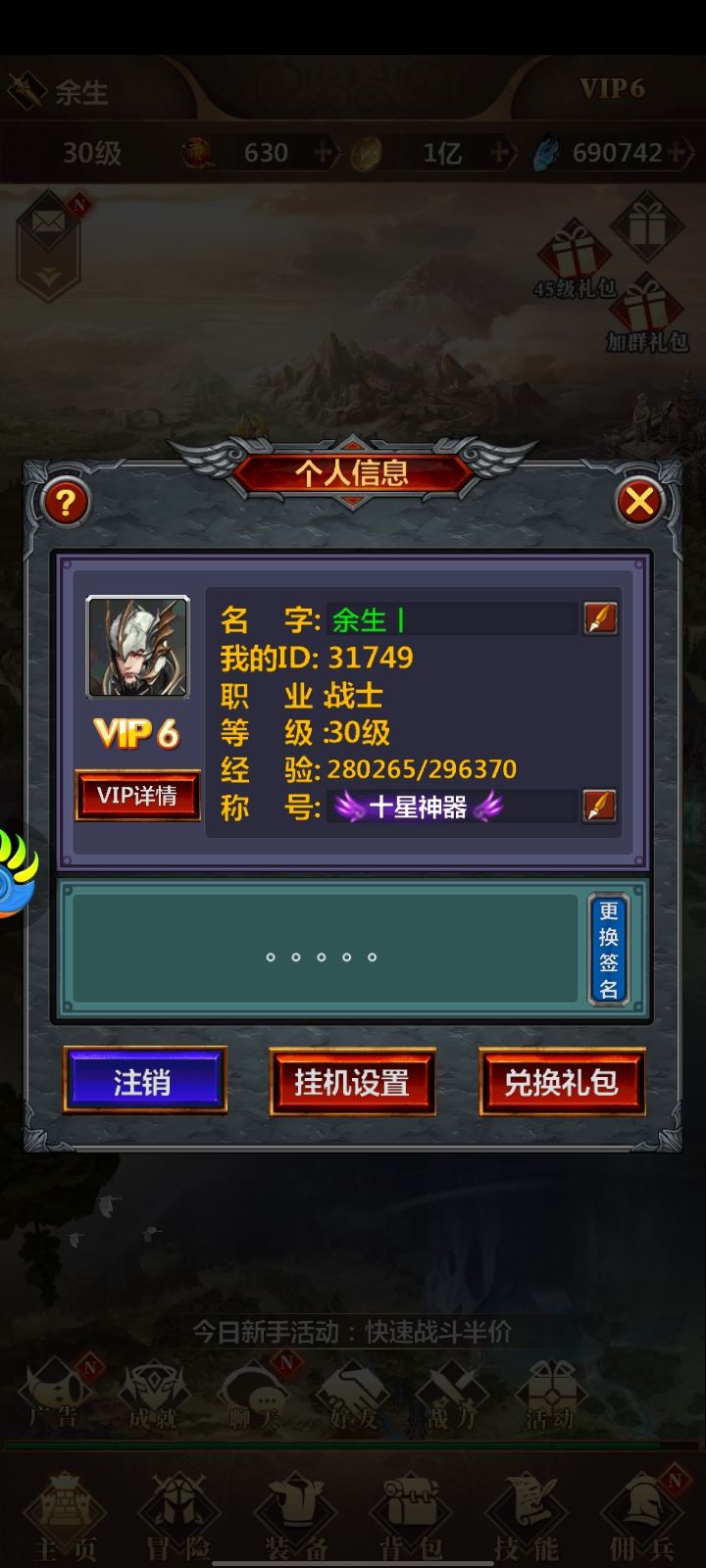 今天是401区开区第三天,抵达100级,即将转生,发帖纪念并分享一下游戏经验。 一、准备篇: 1、攒码,准备一套tap十日签到兑换码以及一套长期有效兑换码(见评论区)。挂机3是每周五上午11点开新区,10点59分就可以进游戏输入兑换码,11点准时进行商店抢购。 2、领取新秀套,新秀套是100级转生前最好的新手过渡套装,可穿至100级转生直接换100级职业套。 3、开龙神,龙神祝福全开每周可以领取