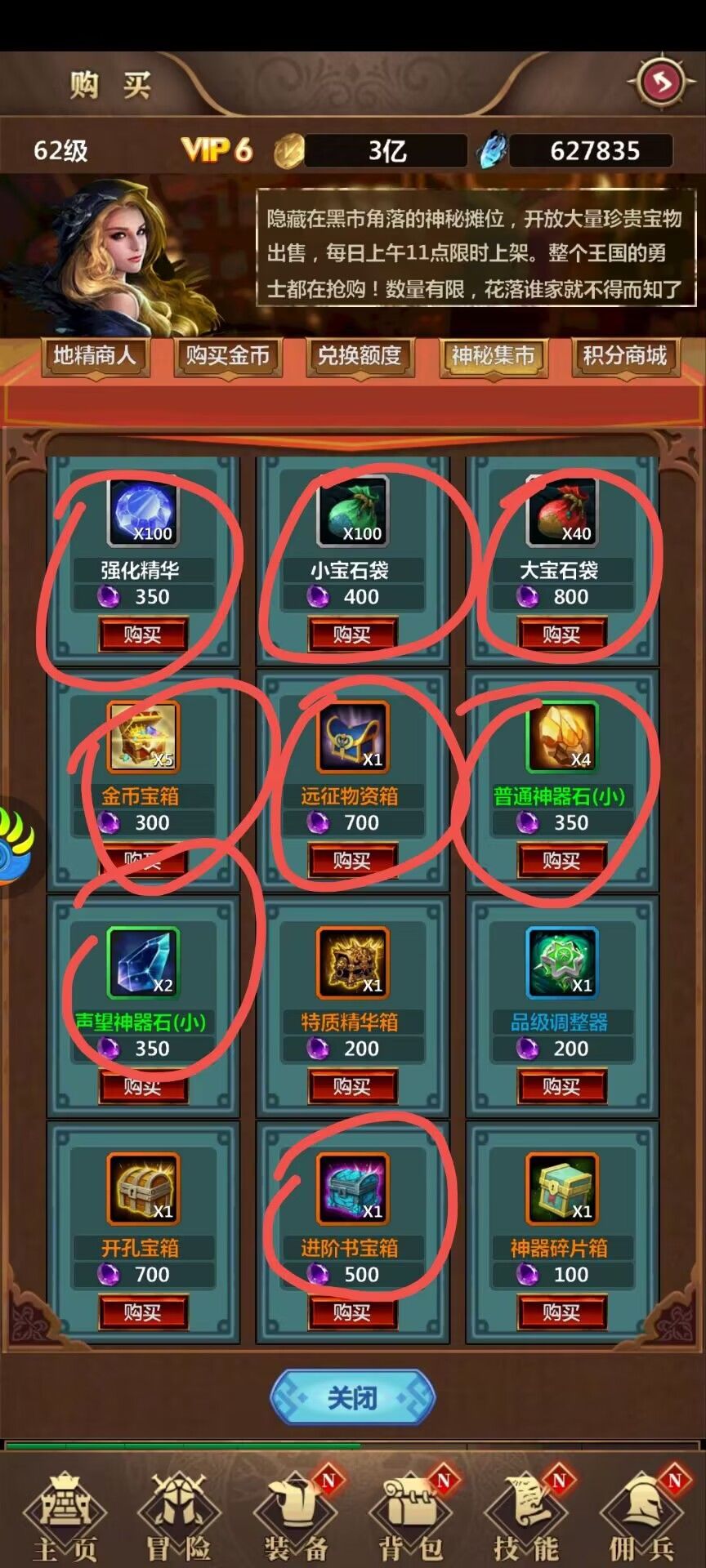 新手攻略1 建号 、礼包码及开局抢购篇:先建角色,三职业除了天赋不同,现在版本暂时建议战士,后续会加强法师猎人,装备和技能都一样可以穿戴学习(神秘集市入口:黑市-神秘集市)(抢购顺序:强化普通神器石-声望神器石-金币袋-小宝石袋-大宝石袋-有钱啥斗可以拿完斗很缺)每天抢购时候11点具体我用秒表看过活动里面限购时间为11.00:30左右,神秘商店的抢购时间为11.01:00左右,一般第二天第三天就优