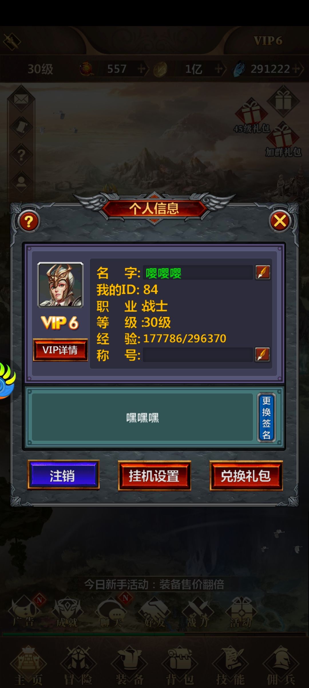 1 建号 、礼包码及开局抢购篇:先建角色,三职业除了天赋不同,现在版本暂时建议战士,后续会加强法师猎人,装备和技能都一样可以穿戴学习。接着就是上线领礼包和兑换码30元充值卡加6元充值卡,如果白嫖玩家可以先用群公告有兑换码(兑换方式-点角色名-兑换礼包-输入兑换码,小技巧提前加群先领取,最好的就是提前到一个区熟悉熟悉游戏管理,升到30级,提前找客服463896357领30级兑换码大礼包(10多万砖石加4-500的代金卷简直对白嫖玩家很友好),微信公众号还有1个兑换码(三十代充值卡)复制礼包码用于后续抢购),如果一起做起就有20万左右的砖石(看你运气开砖石多少)加520代金卷,金币加材料那些。兑换完。领完然后直接去神秘集市抢购(神秘集市入口:黑市-神秘集市)(抢购顺序:强化-普通神器石-声望神器石-金币袋-小宝石袋-大宝石袋-有钱啥斗可以拿完斗很缺)每天抢购时候11点具体我用秒表看过活动里面限购时间为11.00:30左右,神秘商店的抢购时间为11.01:00左右,一般第二天第三天就优先抢购限购里面的,再拿神秘商店的。,只有开区第一天刚好,你兑换了礼包码,就去抢时间为:11.00.00。白嫖玩家为了资源最大化,抢购是提前战力很重要途径。开放数量有限记得每天抢。[图片] [图片]