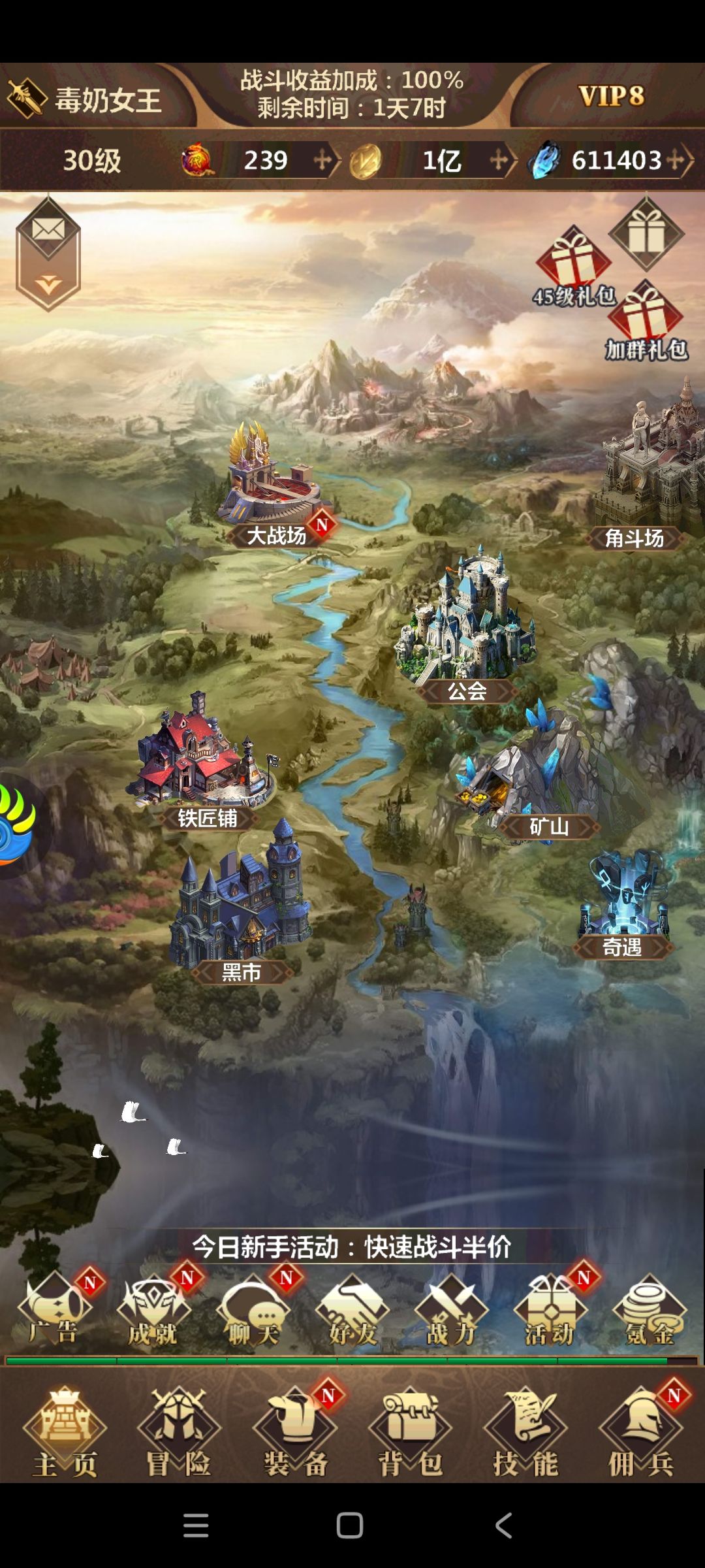 开局三角色战士、猎人、法师,战士PVP、猎人PVE、法师平庸,看个人选择,进去先换礼包码抢(群2个微信1个,30级找客服再领其它),前期能换到66代金券,都领完奖励差不多能有20多W钻石,之后去黑市扫货,强化石、金币箱、普通神器石、声望神器石、进阶书箱一定要买,远征物资箱宝石袋有富裕可以优先购买,每日限购能买的都买完,每日自选第一次可以选熔炼章和声望章,去打造神器,神器开头升经验神器,附魔也是先刷