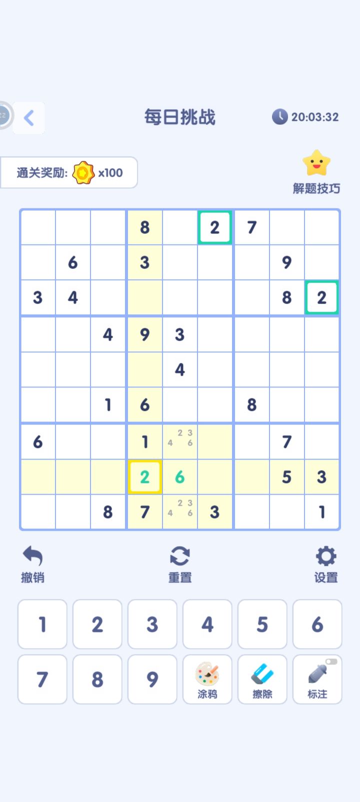 第二个“数独迷宫”:标注无法自动识别是否重复,需要手动消除。长按可以直接选择数字,但容易误触。