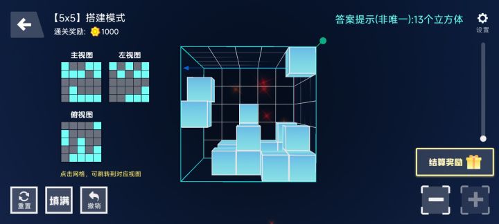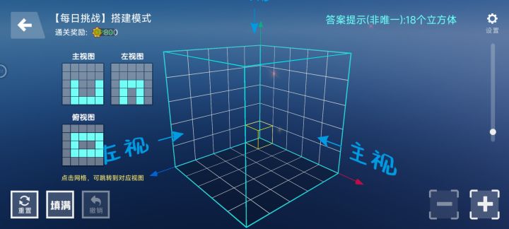 我个人最喜欢的是三视图,因为这是这里面最简单的,点全部填充后按照三视图消除就可以了,还没达到直接搭的水准,打算借此锻炼一下空间思维能力。