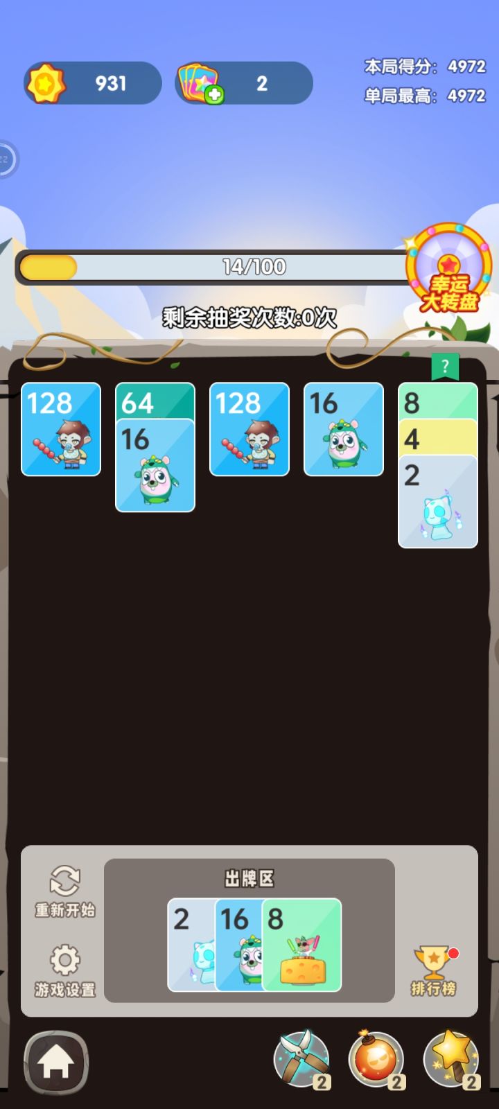 2048也是新玩法,和电脑游戏 蜘蛛纸牌类似,只不过出牌顺序是固定的,增加了电脑度,这就很考验玩家的合理分配。合成可以获取积分,满100分可以抽奖一次,合成2048可以获得80积分,可以单抽也可以批量抽,最多一次10连。