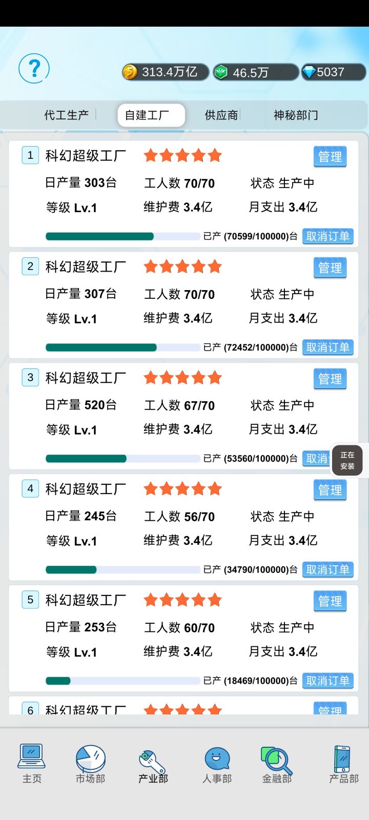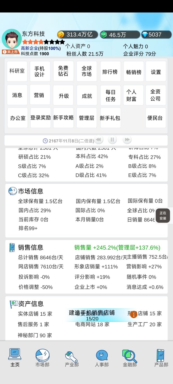 玩了三天,说下心得,用低配机拉低价格增长销售额的手段我们都知道,开局,造一个自建工厂,造在上海,速率最高。然后销售店就一直拉西安的就行,然后就是升级销售和生产的等级。有钱就卡股份(不给股东打工)拉到100%,想上市后面卖点股份就行。形象店一定要拉上来,因为形象店升级的时候销售额的增长还在,所以一直让形象店处于升级中就行,后期的形象店一个就能增长90%甚至更多。销售额上来,没有股东分红,赚钱不就是分分钟的。对了,供应链有钱的时候能拉则拉,降低成本,我们转的钱就更多了