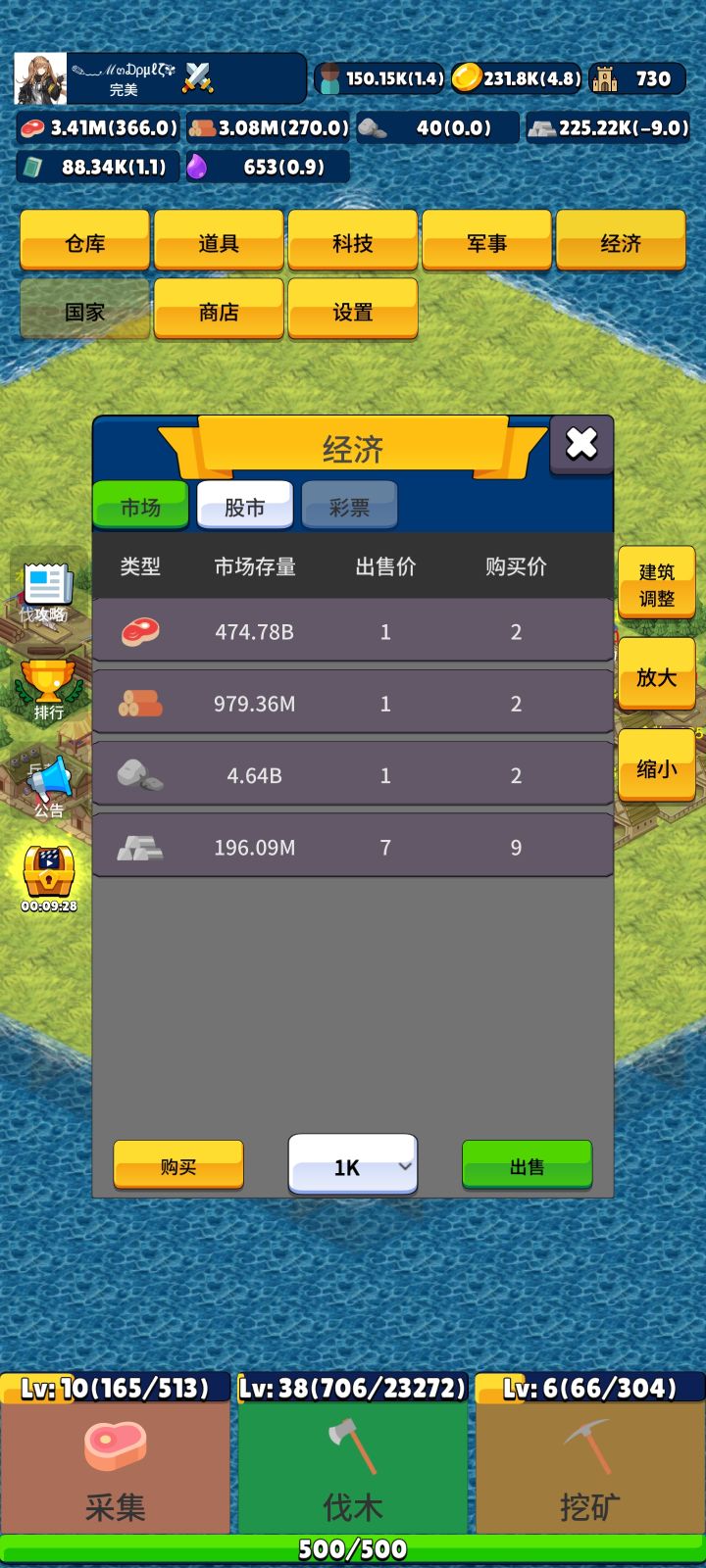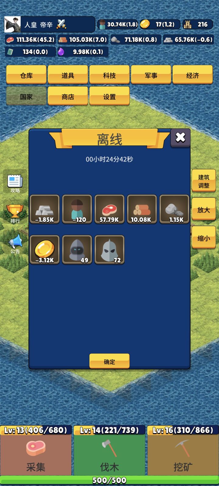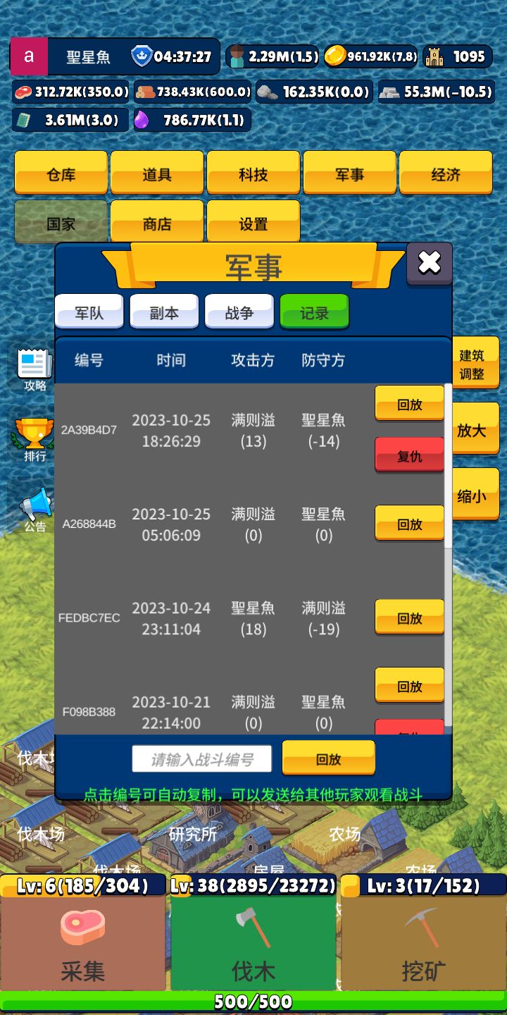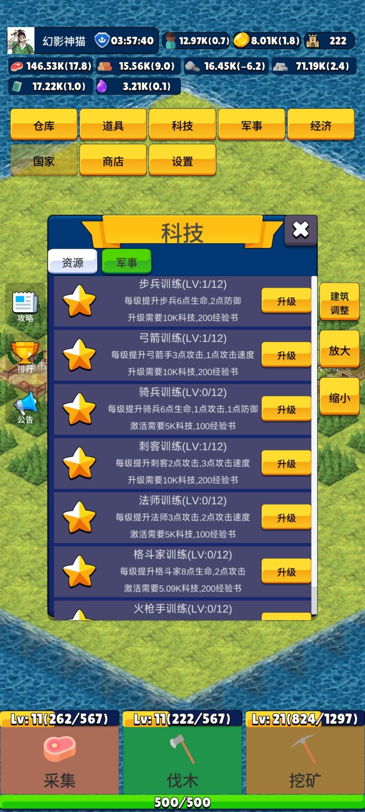 也算是个经历了二测三测的玩家,看都没人写攻略,我就来写写我个人的经验吧。开局先通过下方的点击来获取木材创建建筑物。(下方的点击作者设置的目的是为新人前期提供便利以及打发时间的,而不是让玩家用连点器去获取资源。目前玩家玩法与作者设计初衷不一致,因此对连点器作出了限制)目前推荐的建筑物是农田,因为目前市场就粮食最挣钱,玩家通过卖出粮食获取金币,金币可用于建筑产量科技升级,兵营建造(招募兵种),二级