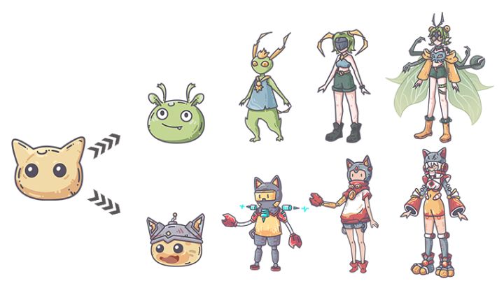 各位冒险者们好呀ヽ(✿゚▽゚)ノ!!这里是小镜子~为您在线播报最新资讯~游戏的开始,主角也就是各位冒险者们都是一个圆圆的毛绒球~冒险者们在养成的过程中通过收集到的各种材料可以选择不同的进化方向~↓↓↓进化图↓↓↓每条线进化的都有专属的英雄技能,可以跟宠物和英灵的技能进行组合搭配。技能除了增加攻击属性之外还会有不同的Buff、Debuff效果。冒险者可以根据不同副本的特性自由组合搭配技能。也可