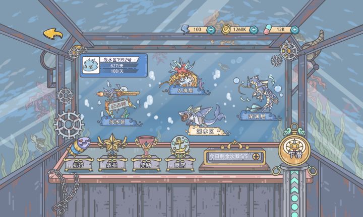 2322年9月12日 晴天放假的日子太快乐了,听说海底世界搞了个比赛,趁着假期打算去围观一下,最好能为我的进化事业添砖加瓦。有一说一,每次来到码头看到这大潜水艇都会疑惑:这玩意儿不会在载着我们的同时还要捞鱼吧......这里比的不是捕鱼,而是抢占捕鱼区,和其他人pk抢占捕鱼区,越深的捕鱼区资源越多,毕竟深海的鱼捕捞难度较大,比较值钱嘛。我按了下潜按钮观察了一会,果然以我目前的水平只能在浅水区
