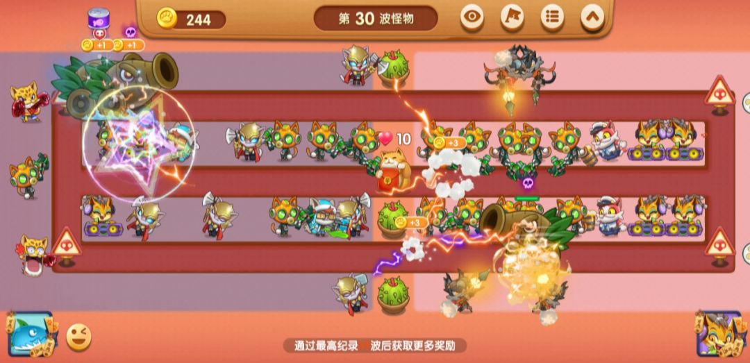 伤害不够,还是耍赖过的~~ 1、绿色的减速猫已经配置好,单体减速效果爆炸,还足够便宜 2、绿色金钱猫也可以加上,打打钱攒攒经济 3、野猪之后会有大蜜蜂出现,那指定就过不去了,一定在蜜蜂出现前集火干掉boss 4、500只怪的任务完成,整好是击杀boss的时机 5、仙人掌一定留住最后一波使用,对boss伤害很高#攻略#游戏安利#游戏讨论#游戏推荐