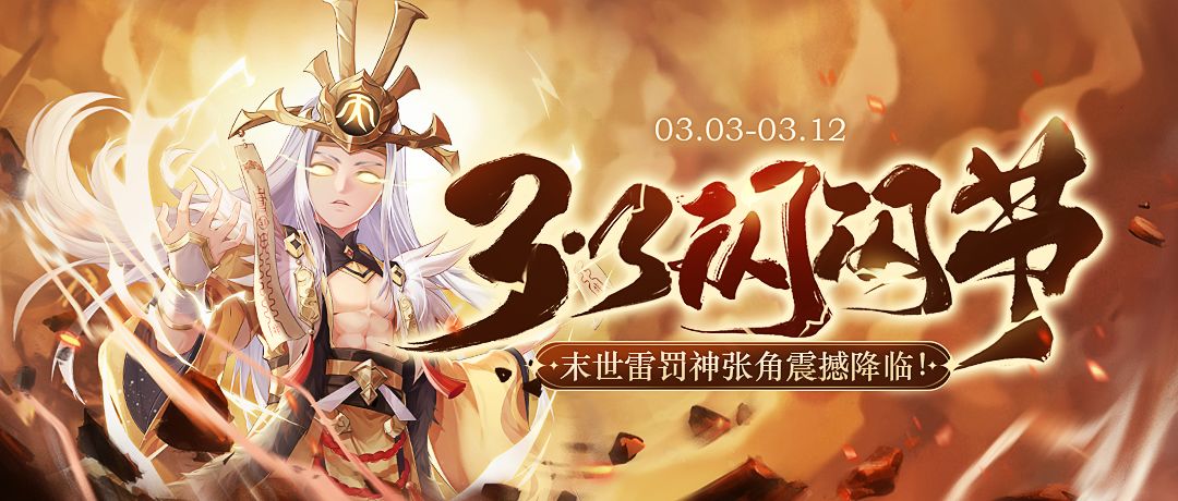 【小猫钓鱼】 活动时间: 3月3日—3月12日 【三三闪闪节】 活动时间: 3月3日—3月12日 【闪闪集字】 活动时间: 3月3日—3月12日 【小猫钓鱼】 概率公示 当期武将(神张角)0.3%,神将0.1%,SSS武将1%,挂机券30%,紫色将印5%,橙色将印1.6%,手气卡12%,换将卡12%,将魂8%,紫色将印碎片6%,橙色将印碎片4%,武将碎片4%,欢乐豆4%,将印经验令12%。 【