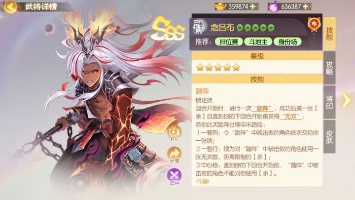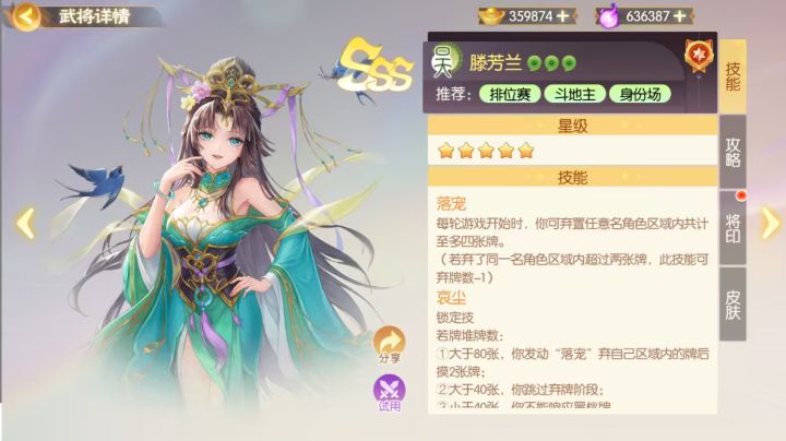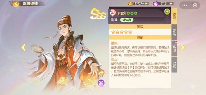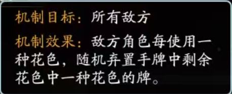 一技能勘集,出牌阶段限两次,你把所有手牌亮出来,如果每张牌花色都不一样,你摸两张牌,要是亮完之后手牌凑齐了四种花色,还能跳过弃牌阶段,等于说手牌全留在手上不用扔,这技能就是鼓励你玩杂花,花色越杂收益越高,凑够四色直接爆上限,二技能怒正,每回合限两次,你出杀或者被别人用杀和普通锦囊指定的时候,可以重铸两张牌,如果重铸的这两张和用的那张牌类型都不一样,等这张牌结算完进弃牌堆你还能拿回来,就是说出杀的