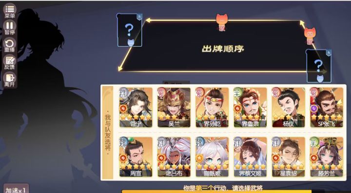 御驾亲征,攻略为本王每日实战的战况小结,与诸侯公主们互相交流学习~不如意事常八九,排位并不是每次选将,都能凑出1+1>2的完美组合。今天分享一场念吕布对战先手战马超+念曹丕的实战对局。一、苦涩选将与后手反制可选武将为:管宁 吴兰 界孙乾 界鲁肃 杨仪 SP张飞周宣 念吕布 喵甄姬 界蔡文姬 星袁绍 滕芳兰3号位:是后手阵容的核心。若是先手,完全可以选出SP张飞+界孙乾,依靠对界孙乾使用