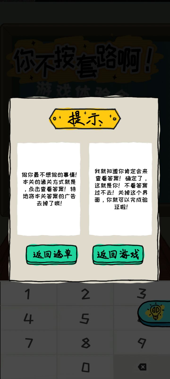 《你不按套路啊》是一款持续更新的关卡类益智游戏,经过一段时间的研发,终于是已经有了15关的内容。起初,这款游戏的设计灵感来源于另一款游戏《There is no game》,这是一款反套路的、令人感动的、给游戏的一封情书,其脑洞之大超乎想象,让我们所有研发组的人员在第一时间体验到之后,便皆为之着迷,若大家有兴趣,可以自行游玩,相信你们不会失望。立项之初,我们的目标就很明确,我们也想做一款反套路