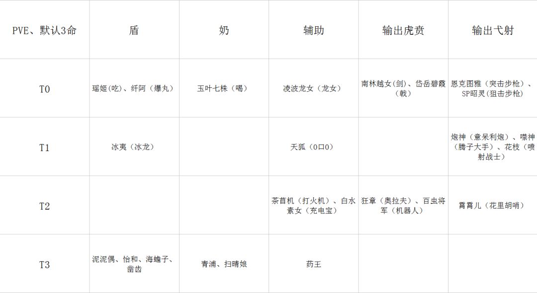 从开服至今我自己练了2个号,不论非欧氪过月卡,基本上所有角色都抽到且3命以上,应该有资格来谈谈目前版本下角色强度。先说下这个游戏(PVE)颜色克制影响很大,同色有2倍增伤,颜色被克下要削一半伤害,所以:红色打不了黄色,蓝色打不了红色,黄色打不了蓝色。记住这些克制再来看看强度(排名不分先后): 【输出】 越女(红):第一个限定池角色,强度有目共睹,目前唯一一个真伤选手,普攻流,攻速流,伤害高,红色和