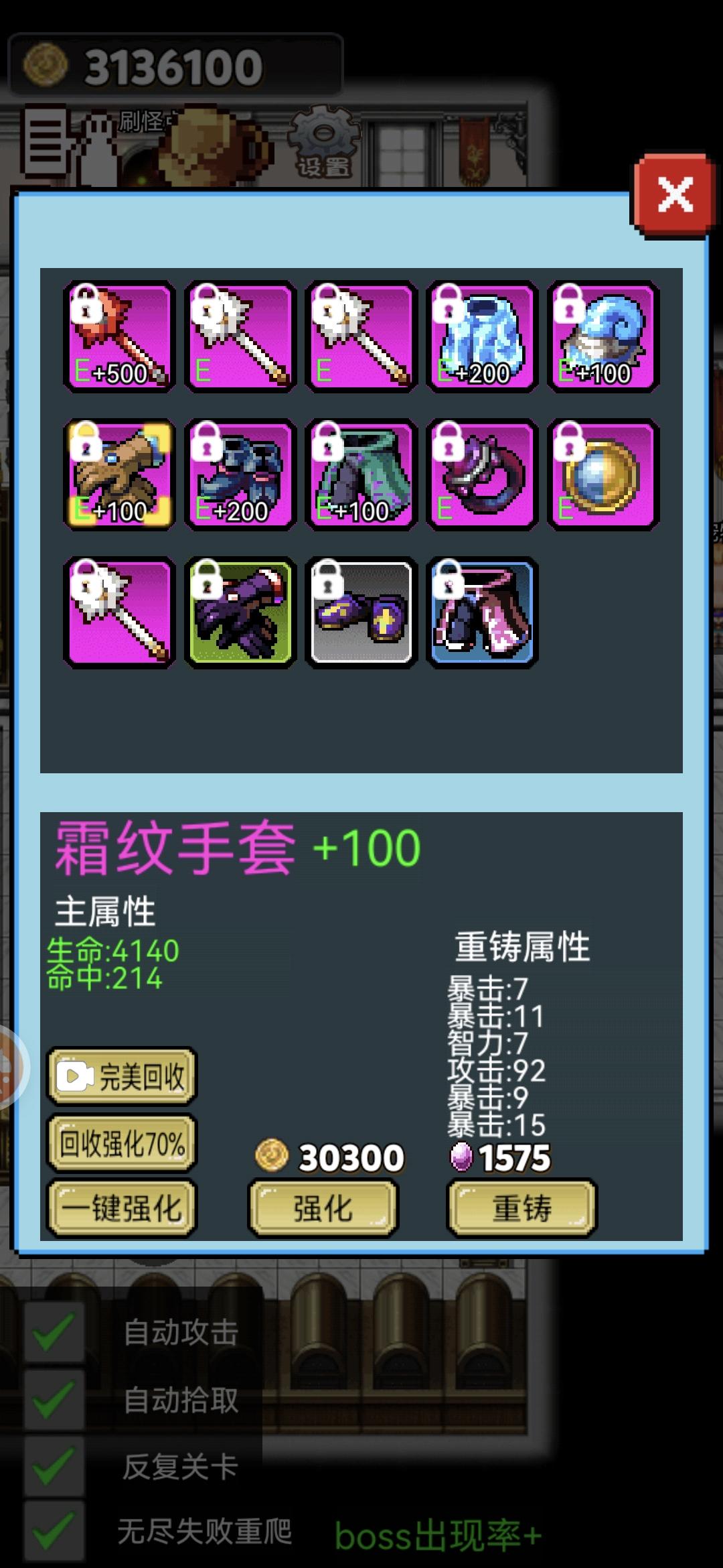 写个攻略,法师全智力法师怎么说呢,伤害高,魔抗高,配个吸血随便打,成型有点麻烦就是了必备贤者之石,三把杖至少三个黑龙波,越多越好,吸血光环,没有自己凑吸血。打boss站脸上放,没错就是站boss面前伤害最大化,受到的伤害靠吸血吸上来,放完一个武器的黑龙波切换下一把武器放,要无缝连接至少五条龙,龙少就间隔慢一下。除了50关boss伤害太高不能站脸上,其余都是无脑这么玩。50关boss的话一直圆形