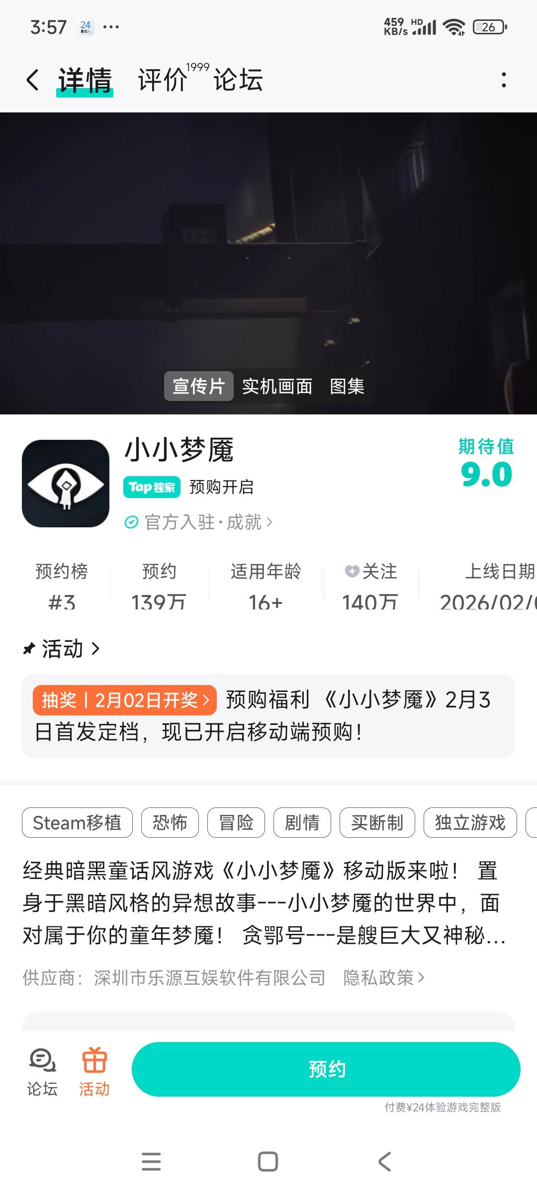 🚩游戏类型:steam移植、单机、独立游戏、恐怖、冒险、剧情、买断制、解谜🌋折扣优惠:·TapTap渠道开放第一章整章免费试玩,后续全章节解锁售价 30 元。· TapTa渠道已于今日正式开启预购,预购享受8折特惠价24元! 💥经典暗黑童话风游戏《小小梦魇》移动版来啦!置身于黑暗风格的异想故事---小小梦魇的世界中,面对属于你的童年梦魇!!!!感兴趣的小伙伴可以点击评论区上方的游戏链接【