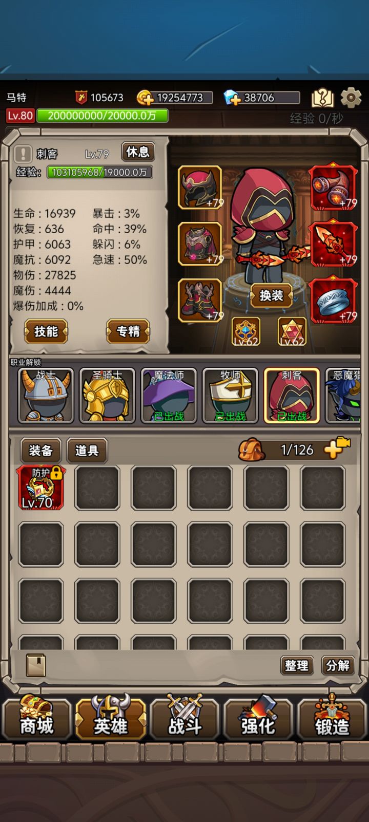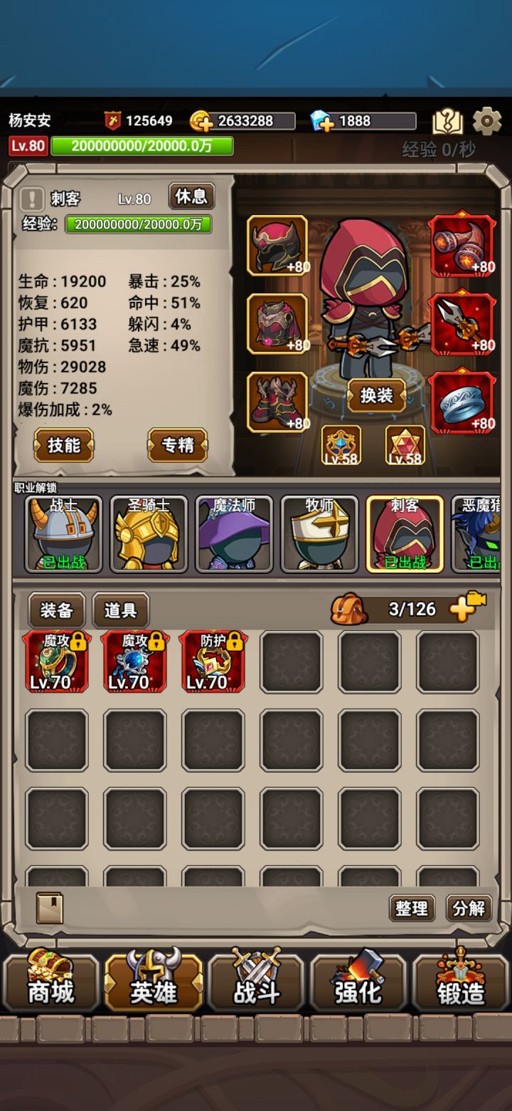 P1.练级阶段一、开英雄战士→恶魔→牧师→法师→骑士(不是非要这个顺序,但这个顺序玩起来打boss没那么累,练级也不是特别慢)。二、练级开法师后,用法师、牧师、恶魔练到法师58级套装齐,理想状态是法师60级寒冰箭加了天赋后能秒55级小怪。接下来优先带战士、刺客至60级(为下一阶段积累装备做准备),接下来练牧师(50多级牧师一样打6层),最后恶魔和骑士。三、技能&钻石此阶段技能注意升点寒
