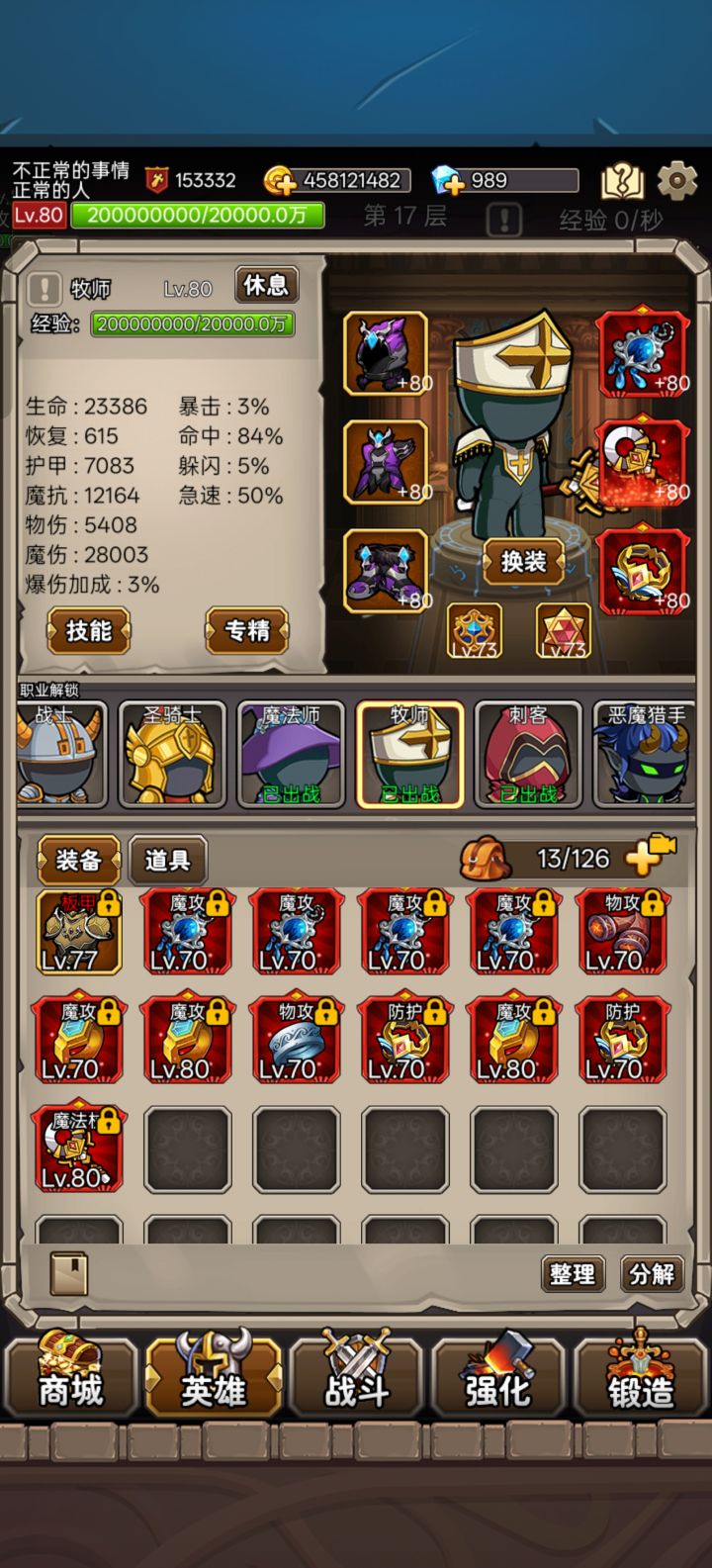 1)人物:解锁顺序战士,法师,牧师,骑士,刺客,恶魔,如果你用战法牧开局能比其它角色更快速的堆等级,恶魔)不多说了这个版本的废物,刺客前期没啥大用而且带着很容易卡关,这里的前期指的是80级所有普通深渊boss,刺客是用来后期刷副本的,前期用战士顶boss就够了,战士顶不住就奶骑去顶,法牧输出。不用急着开刺客,80级深渊boss,会让你待够2到3个星期的攒套装时间,足够把刺客升到80级2)装备:点