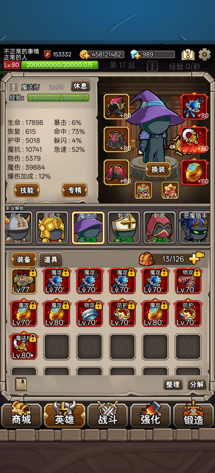 P1.练级阶段一、开英雄战士→恶魔→牧师→法师→骑士(不是非要这个顺序,但这个顺序玩起来打boss没那么累,练级也不是特别慢)。二、练级开法师后,用法师、牧师、恶魔练到法师58级套装齐,理想状态是法师60级寒冰箭加了天赋后能秒55级小怪。接下来优先带战士、刺客至60级(为下一阶段积累装备做准备),接下来练牧师(50多级牧师一样打6层),最后恶魔和骑士。三、技能&钻石此阶段技能注意升点寒