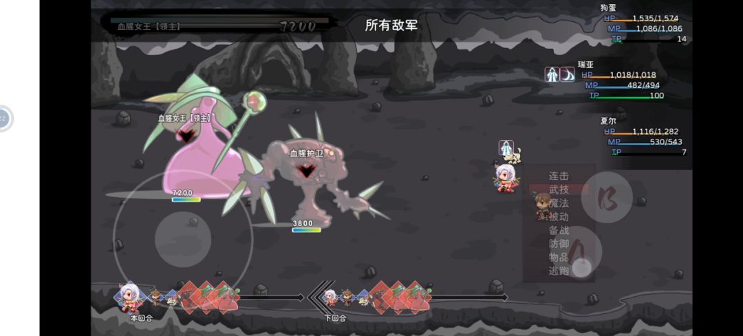 因为女王伤害太高,双法师c完全扛不住,所以只能靠秒杀带走,需要一点运气。 思路1:雷击术30%概率眩晕两回合 思路2:极度兴奋+卡尔奥义+主角奥义补输出,一套技能女王必死 思路3:接下来三个人磨死机器小怪就行了 队伍差不多十八九级就可以尝试,不是极限,装备的话法师套+女王权威,只有卡尔的武器强化+8,其他都是白板。属于运气阵容,打前存档,基本上两三次就可以过。