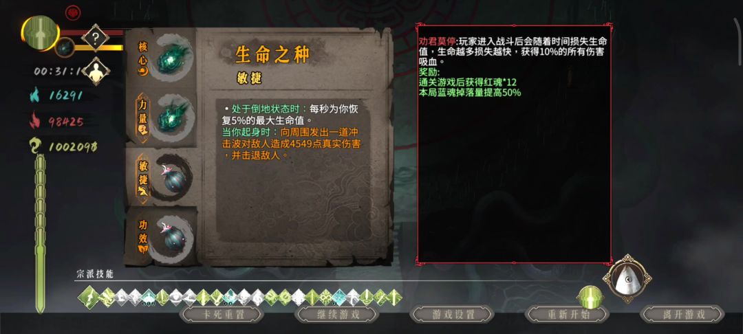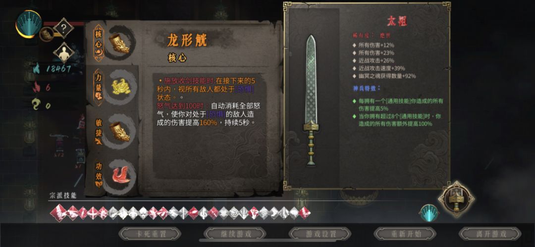 开局防御-600%,被摸一下就当场去世? 走火入魔-300% 疾风骤雨-250% 四号位猪心-100% 白灰难度四剑杀秦武,十一刀怒斩龙帝!!! 注:伤害空间还有很大提升,新手玩家没红魂武器没洗,秘籍没有刷到斩龙决,因为蓝魂少商店的圣物只买了两三个,红魂的buff只买了一个 视频中失误了不应该捡剑,因为有少一把剑加5%攻击力的秘籍