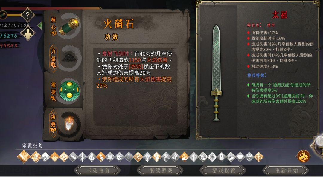 一号位:黑火药 二号位:墨火结晶(核心),造成额外火伤的同时造成百分比伤害,搭配高攻击频率的万剑,告别刮痧 三号位:火硝石/三色结晶 四号位:憎恨之心 武器:太祖yyds,不要专武,虽然可以不吃剑热值,但加的飞剑伤害并不需要 其他火伤,全伤看着拿就行了,不需要远程伤害 能在远处秒人自然就不需要走位的