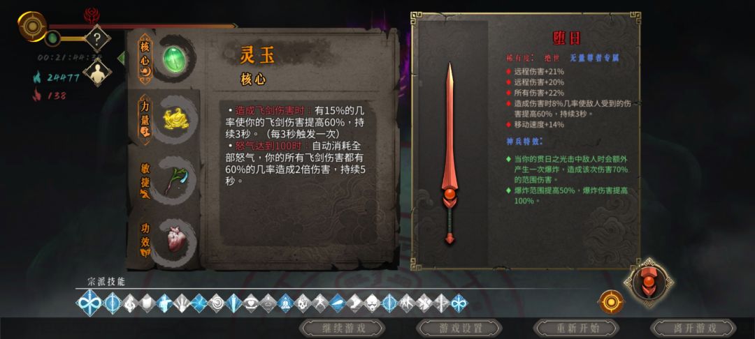 圣物搭配:(3.4号位出门必须都拿到,1.2号位随便拿没优先级) 1号位:憎恶之心/狂暴之血/青龙之魂/踏风草 2号位:青龙之魂/灵玉/踏风草/(有狂暴之血可以拿凝气草) 3号位:堕龙 4号位:憎恶之心 武器: 太祖/堕日/普通 武器词条:(冷却要拿够) 收剑冷却,飞剑攻击,所有伤害,蓝魂获取,怒气获取 技能搭配:(有优先级) 主要:走火入魔,不二打,疾风骤雨,魂多势众,百步穿杨,(专属技能加伤害