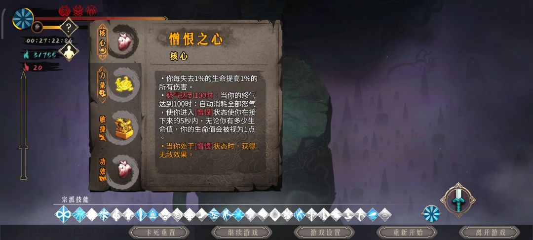 这是只能白灰才能玩爽的流派,三难度因子只要没有减飞剑伤害的就全选,有的话就卡死重置,保证第一波有1000魂消费,换出一把骤雨出来,顺带一提,你的武器如果没有变化换的武器无论重置多少次都是一样的,如果换完没骤雨就去铁匠那点一下品质再换,铁匠打的品质随机并且能影响换武。