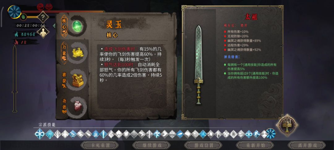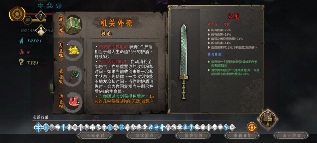 开局圣物拿 三号位踏风草和四号位黄纸,黄纸可以补前期没有贯穿之刃的空档期,建议必拿(经测试后期4号位憎恨和黄纸秒伤差不多 憎恨可以面板好看 而黄纸攻击频率很高) 毕业套1灵玉2玄武3踏风(冷却满了或有骤雨后再可以换须臾或者堕龙这俩都没有的话就带着踏风 踏风触发的收剑可以吃到骤雨的伤害加成)4黄纸(武器太祖或骤雨)想要最高伤害太祖还是第一优先级有踏风草不用在乎冷却(视频白灰难度武器骤雨)