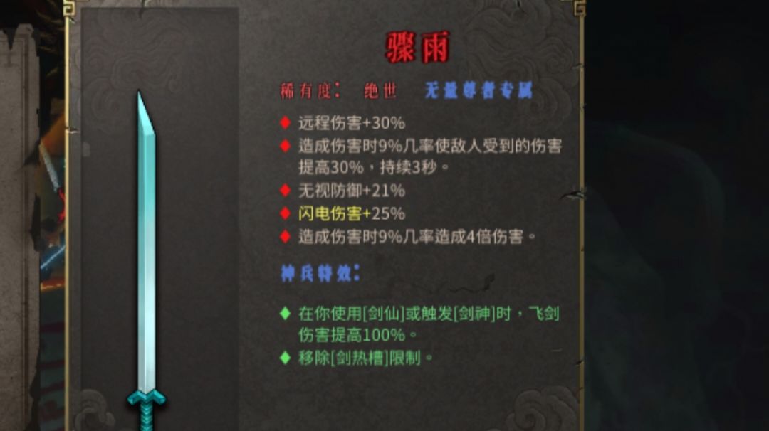 流派特点:视距外输出,超安逸 弱点:成型难度高,成型前非常刮痧,但成型后又根本看不到怪,不知道自己伤害多高有点郁闷 这个流派在拿到专武骤雨前,随便带把减收剑冷却的武器,在拿到骤雨后就无所谓冷却了 墨火结晶出门,放二号位,万剑本身伤害比较低比较需求生命百分比或者真实伤害,虽然其他圣物也有真伤但这个最容易触发 踏风推荐开局刷一个,拿到骤雨前放 三号位拿到后放四号位 其他圣物随意,加伤害的就行 万剑技能
