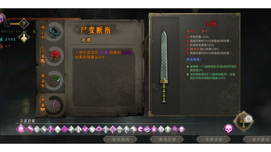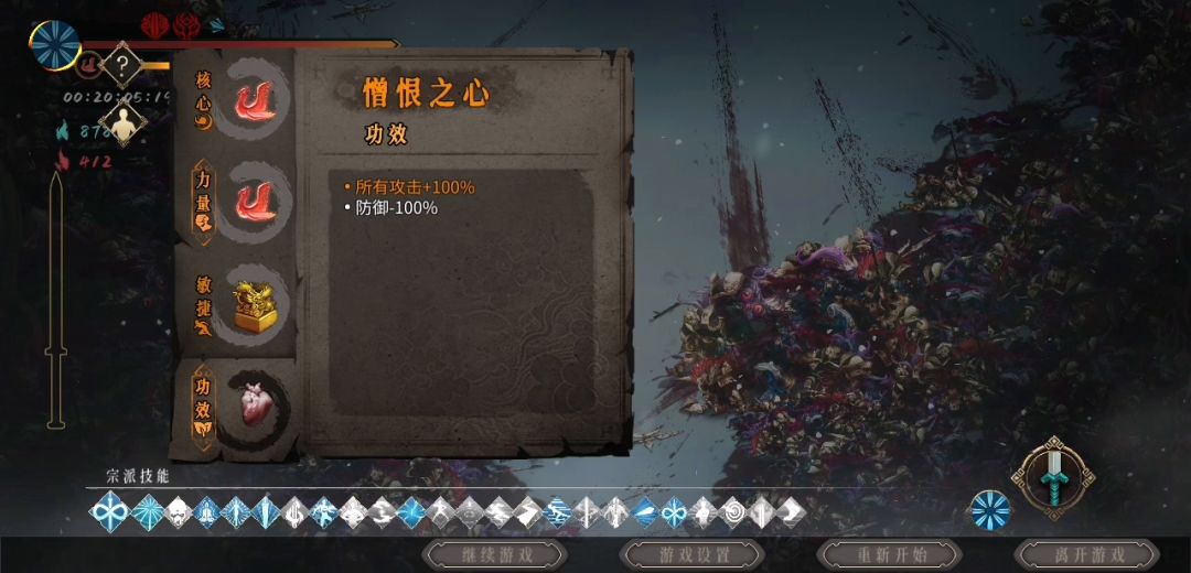 白灰基本上通了一遍,没有速刷的耀眼成绩,手比较残,因此在理解游戏技能、圣物搭配之后,分享一些适合手残党或者新手的操作比较无脑的心得。关于其他职业也可以和我交流,每个职业我都玩过几局白灰。 万剑从名字上看,玩的就是一个高频输出带来的爽快感,特点是屏幕外输出,割草打boss都非常爽。 开局个人刷个二号玄武+三号堕龙就出门了,没带踏风草,原因在于可以拿专武取消剑热值(下图),拿玄武加防御和攻击增加容错率