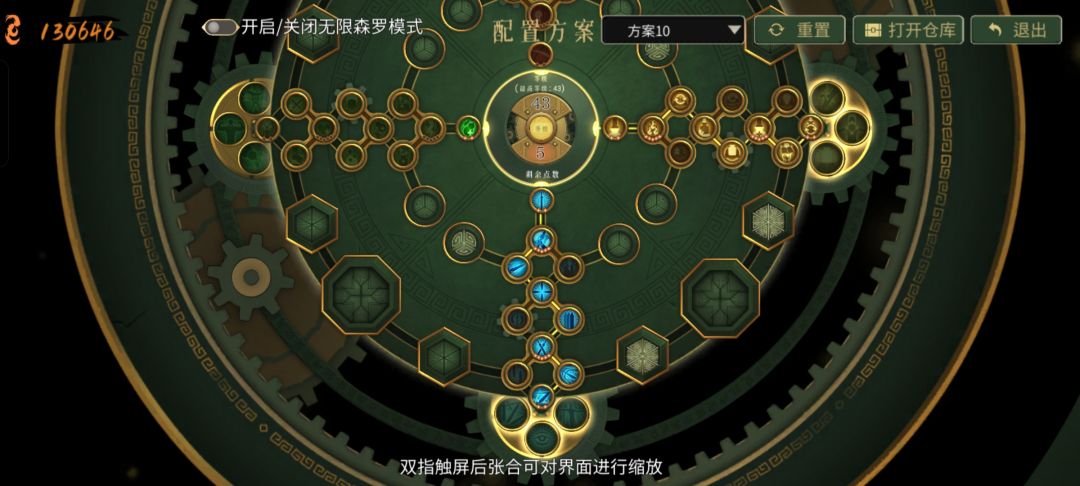 森罗加点建议黄蓝(若开局拿母印,蓝系一二节点需要更换),利用万剑射的又多又快的性质快速打出特效减少cd,最后一个可以自己发挥,不要两个次级残响,去点两点绿,可以多两瓶葫芦,提高前期容错率。终极残响的选择有很多,但是这个打法得有一个三彩词条,另外百兵苦海森罗等均可。 利用万剑射的又快又多,搭配三昧真火九天玄冰掌心雷,以及圣物的组合,打高频飞剑元素真伤,五伤流,满屏幕花花绿绿的,花里胡哨的同时伤害还不