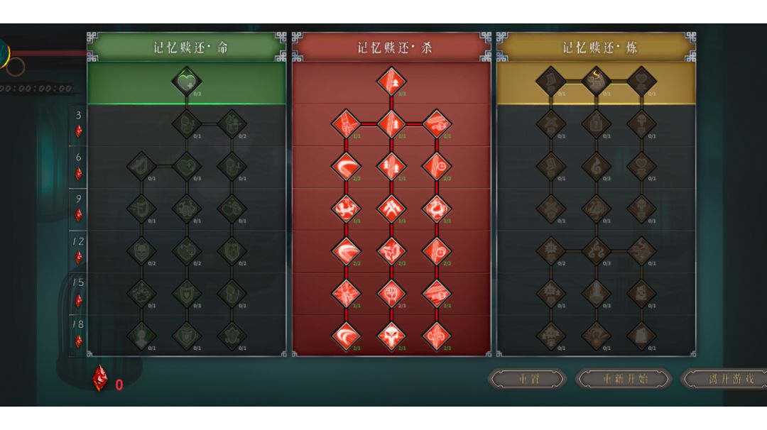 本体:刚开始初始职业 七剑修罗,玩剑二(拜佛像左边是一右边是二),有啥拿啥稳点打,看掉落物词条四个位置哪能加近战属性放那,打序章没问题了。 剑二圣物搭配,1狼王白鬃,2锐利之牙,3青钢,能加近战属性都可以放,我们的目的是能打过第一章吕坤海, 打不过就刷序章攒红魂点天赋,天赋页加点顺序黄>红>绿。(黄加满我们出门就可以带两圣物加一本秘籍) 第一章打完会解锁新职业-神饮明王 玩酒二,出门带墨火和火硝石