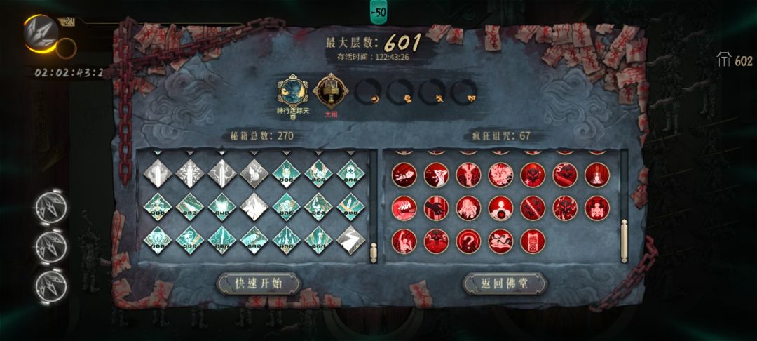 混沌断点,没开森罗模式,9红魂挑战,14分钟秒伤千亿,比雷一还要无脑。 出门:踏风草,序章sl个君莫停红魂挑战,绑定瞬身和飞剑(当然你也可以全都绑) 武器:回魂,没有百兵残响就太祖 …………………………….………………………………………………近战流派通用圣物:1神皇2玄武3须臾4猪心,这套圣物是伤害最大化的搭配,面板就215全伤加成,加上猪心翻倍,基本上都是见什么秒什么,飞剑远程的也可以用,只不过