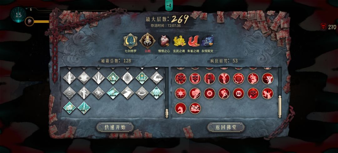 玩着玩着发现一个套路。开局就选个生命之种放4号位,挑战选个劝君莫停,攻击一下怪就可以一直触发回血,然后安稳度过前期。何罗神祇(远古宝库词条)又能让我们后期无敌。直接稳稳通关[表情_斜眼笑]