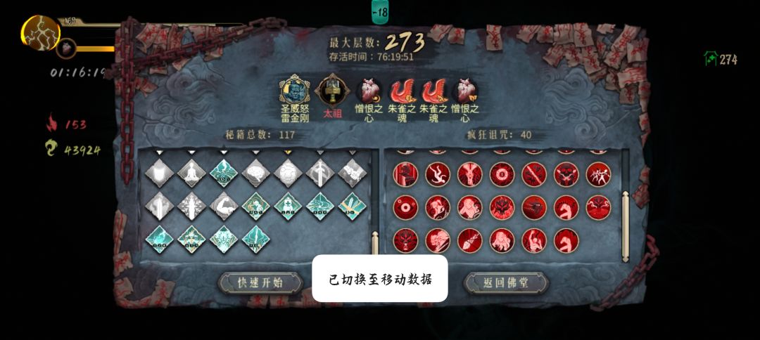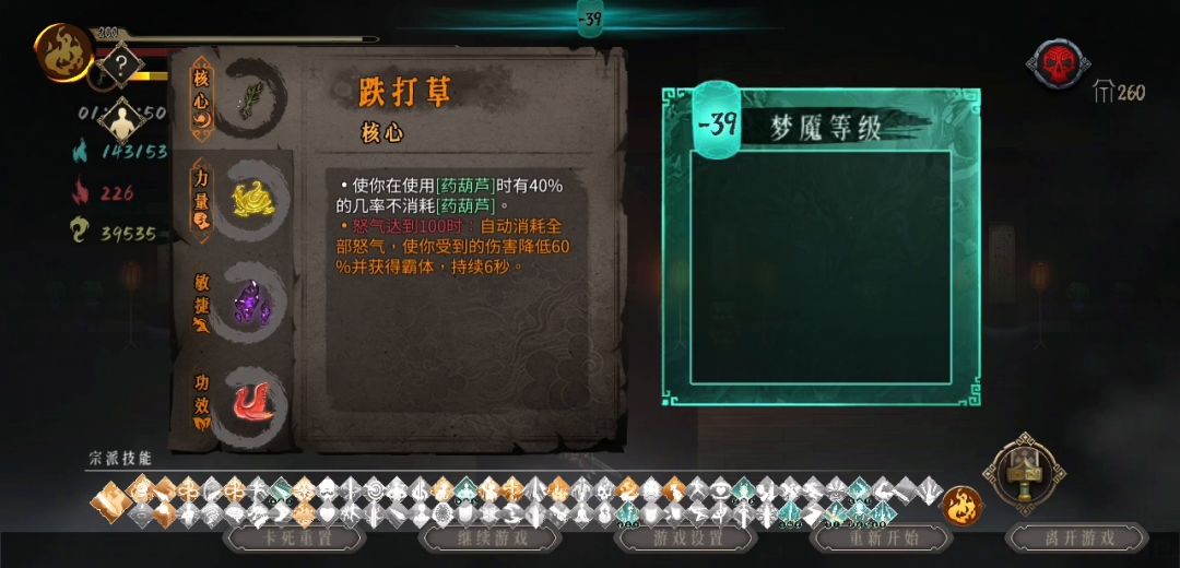 所有的刷都靠SL完成 开局刷走火入魔buff,自选四号位火硝石。爬层遇到墨火结晶装2号位,朱雀之魂三号位(传说级最好,其他颜色的也能用)。一号位任意皆可 五层小boss刷魂多势重或者蛇之酒(蛇酒最好龙酒前期伤害低一点),十层刷诅咒贪婪惩戒(获得蓝魂加500%),15层魂多蛇酒没啥刷啥。过层宝箱有圣物的选圣物,没有随意,每4,9层圣物全部购买。打完boss后梦魇秘籍有梦魇葫芦就选,没有则右上角放弃。
