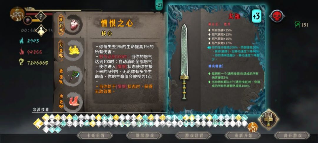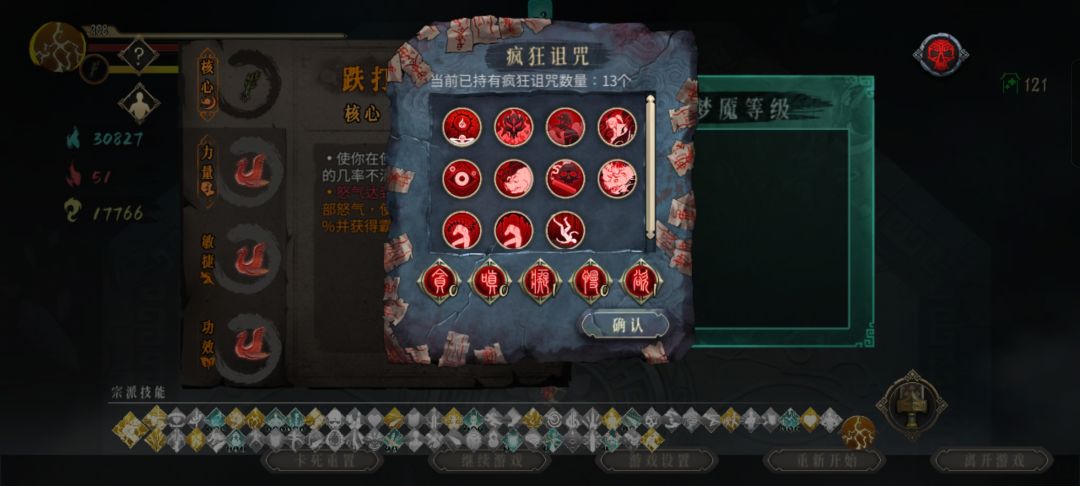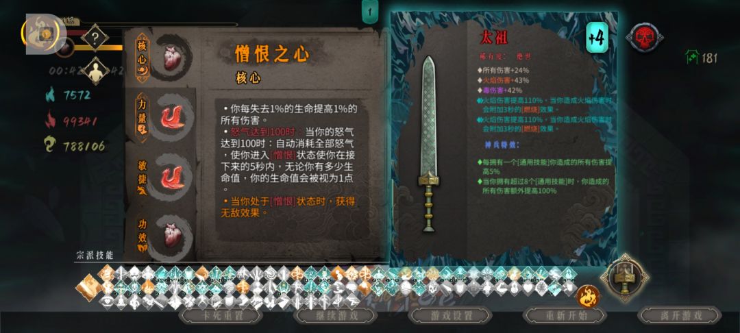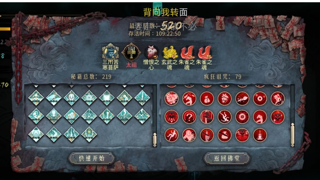 核心憎恶,2玄武,3朱雀[雷1需要换成踏风草,神行也是踏风草],4朱雀 圣物精炼选生命 梦魇选体魄,掌控,血盾,药壶,嗔怒,回返。 诅咒不要拿给怪上无敌的,还有大幅度减益的,多拿怪物加伤类型的诅咒,反正怪打不死你。 武器拿太祖洗练推荐霸体+3怒。 想打发时间猛刷无尽的建议修改一下黄魂把清明觉醒升一升,清明觉醒再加个200就够了。