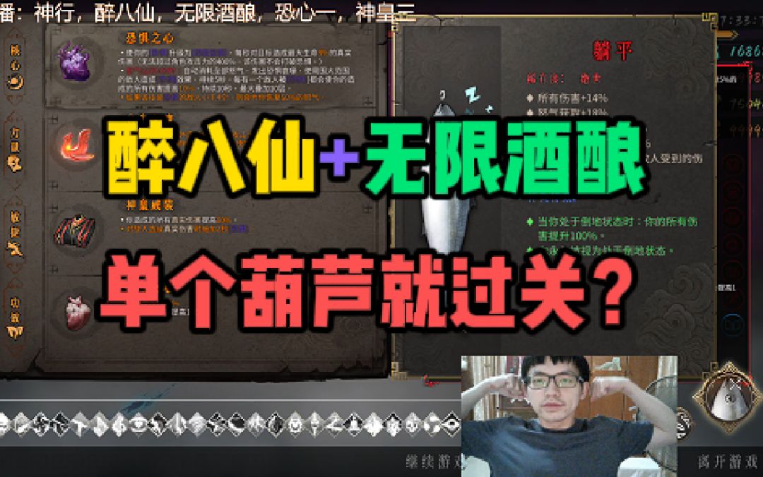 无限酒酿(绿色最终天赋)+醉八仙(终极残响词条,伤害跟自身攻击力相关) 恐心一神皇三(真伤启动,自身攻击力越高,恐心一的真伤恐惧越高) 这个搭配,还是需要发牌好一点的,不然想单靠葫芦过关,攻击频率有限,整体节奏就会偏慢了