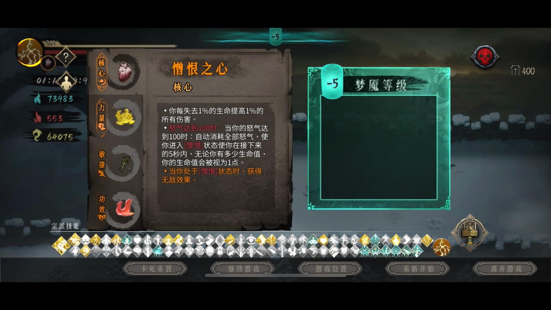 相信不少人想玩神行最苦恼的就是前期杀小怪的问题被劝退,这里这套思路教你前中后期杀穿到底 出门摇出猛虎放三号位,四号位建议生成个猪心,最后利用卡死重置秘籍摇个走火就可以出门了。 有了猪心和走火,前期利用猛虎三号的瞬身八荒破秒小怪非常轻松,解决了神行1前期容易暴毙的问题。 前期武器随意点,最好有蓝魂收益词条,攒钱。一般第三关钱已经差不多了可以开始搞武器,建议太祖,词条优先攻速,数值来说最高。 秘籍里魂