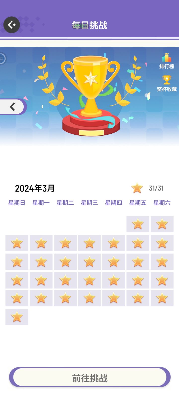 进去之后点击奖杯收藏,随便一个月,就会出现正常的界面了,然后点前往挑战即可可能出现的情况1.点击后黑屏 2.点击后正常使用但是看完广告,显示多少百分比玩家成功后停留在原界面没什么解决方法,我只能重开几次,。。。。然后就好了