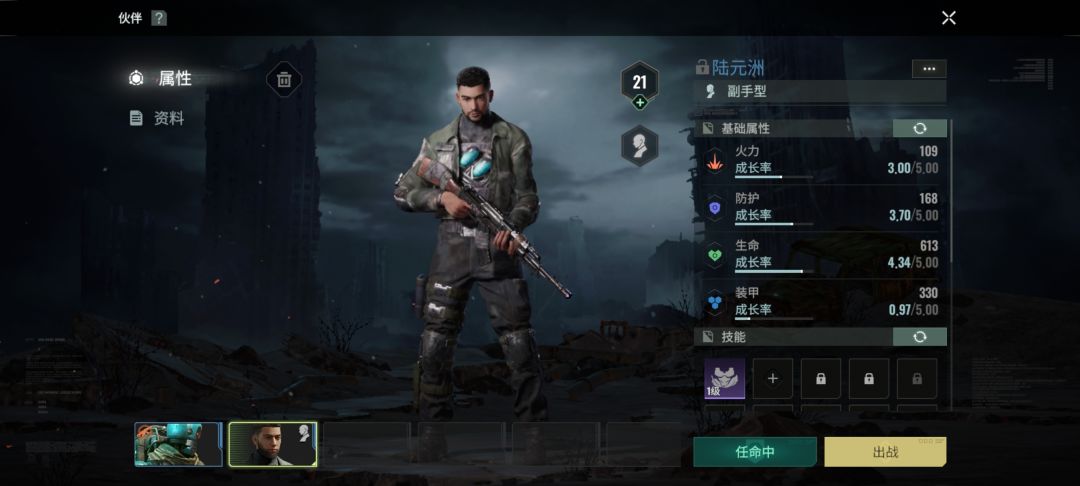 适合属性不高的平民和手残党,或者手机不好操作的,这伙伴简直就是战神,高护甲高血量,同时大大盾上还有伤害减免(基本不掉血),每隔一段时间还会放隐藏技能嘲讽,好像是他的状态栏底下会有一个绿色图标,大部分敌人全部会去集火他。 平常哪怕你用药瓶躲掩体后都不一定有他能抗,超级战神,输出还高,轻松帮你分隔战场,再也不怕怪海扫射。
