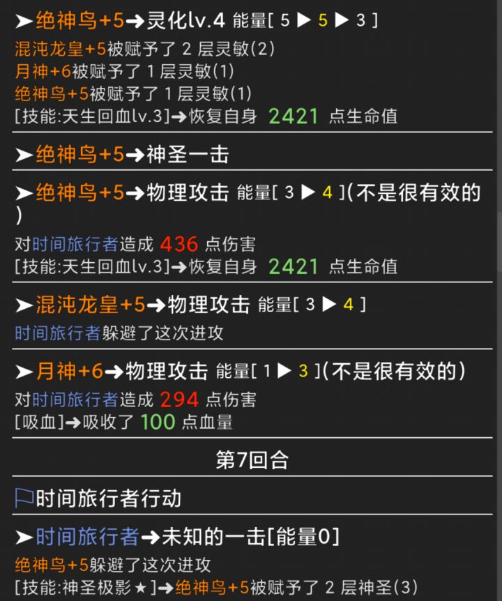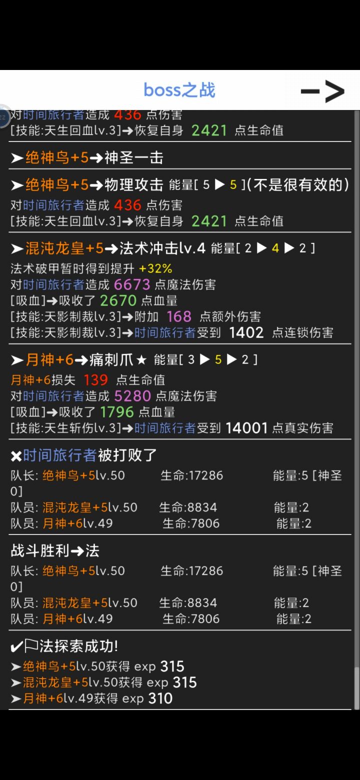 记录第一次完成游戏。根据实际情况,选择了闪避回血流,利用神鸟自带每两回合回血技能以及闪避会加神圣值有时候可以达到一回合回复两次的情况,回复量非常大。后排输出是两个法系输出,一个自带末世效果一个自带斩杀效果,末世(当前血量百分比伤害),斩杀(已损生命百分比)二者完美闭合。舒服了