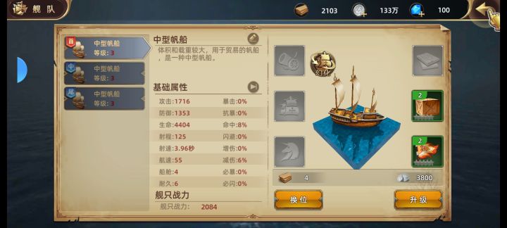 舰队船只通过造船厂建造,种类非常多。可以进行作战编队,设定首中尾三船,堆战力即可。单船只有等级、装备两条养成线,提升相对缓慢。