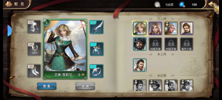 船员总计70人,有品级、阵营设定,最大上阵位八个,每10级解锁一个上阵位。单船员有等级、装备两条养成线。装备也有品级,有资源的话可以直接在海图商人处兑换装备。