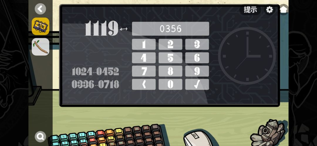 剧情后走出电梯进入研究室,小仓鼠真可爱戳两下,取下右边台灯灯泡,查看电脑拿走前面像是树枝的铅笔,这里给出的线索是1024-0452,0336-0718,结合右边钟表图案,画一下10:24发现如果把分针时针互换不就是4:52么,所以只需要将11:19的分针时针互换就得出了答案是3:56或者3:57,当然按比例算一下会发现是舍弃小数点后的,不过米雪更建议试一下是56还是57就好了!简单一试是0356,