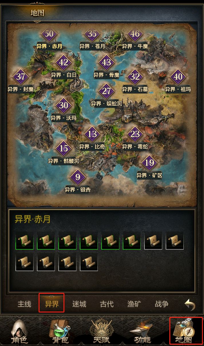 由于前期升级比较快,基本3-4个小时就可以30级了,30级以后打装备可以优先考虑去异界地图,位置点右下角的地图,第二个异界就是了 异界的玩法大概就是需要先去主线刷怪掉落异界地图,具体的掉落可以在主线点每个地图分别查看掉落,具体看下图,橙色BOSS的掉落概率会大点 那么有了异界地图在哪里看呢,打开地图-异界,点击每个异界地图可以查看你有多少,每张地图只能进去1次,就是一次性的,有概率异界前缀的装备 异