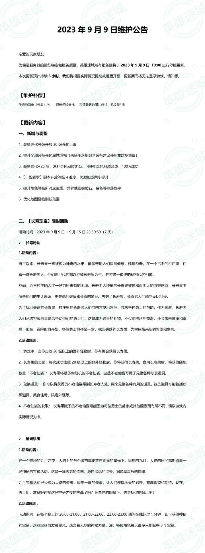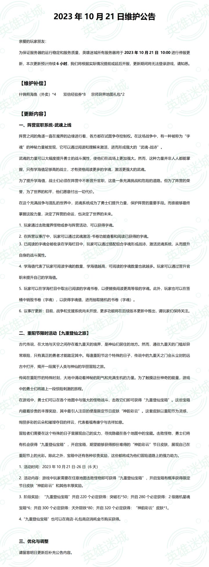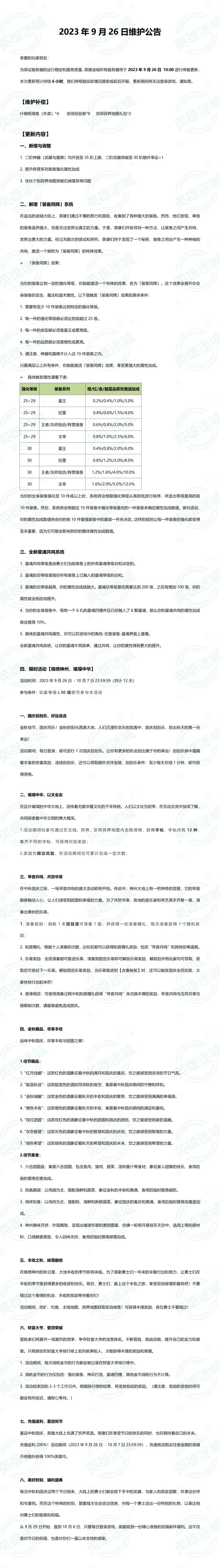 2023年10月7日维护公告亲爱的玩家朋友:为保证服务器的运行稳定和服务质量,英雄迷城所有服务器将于2023年10月7日 15:30进行停服更新,本次更新预计持续1小时,我们将根据实际情况提前或延后开服,更新期间将无法登录游戏,请知悉。以下是本次维护的更新内容,请您仔细阅读以便更好地参与游戏:1. 星魂的凹槽重置功能升级,新增自动重置到指定孔位的功能,您可以手动设置开启这个功能。2. 从曙光林地开始,主线地图和异界地图现在会掉落更多神兵材料,包括拓印和打造书。3. 对于神话金币宝箱(兑换路径:璀璨中华-音律商店-玉符商城)等类型的道具,现在新增了批量开启的功能,让你更便捷地打开多个宝箱。4. 请注意,“璀璨中华”活动中的“以文会友”、“琴音共鸣”、“音律商店”、“财富大亨”活动的结束时间是2023年10月7日23时59分59秒(包括兑换时间)。请及时领取和兑换相关道具,以免造成损失。5. “璀璨中华”活动中的“好运连连刮刮乐”活动将会延迟到下次更新。如果您的刮刮乐还未刮满,您仍然可以继续参与活动。感谢您的理解和支持,祝您游戏愉快!