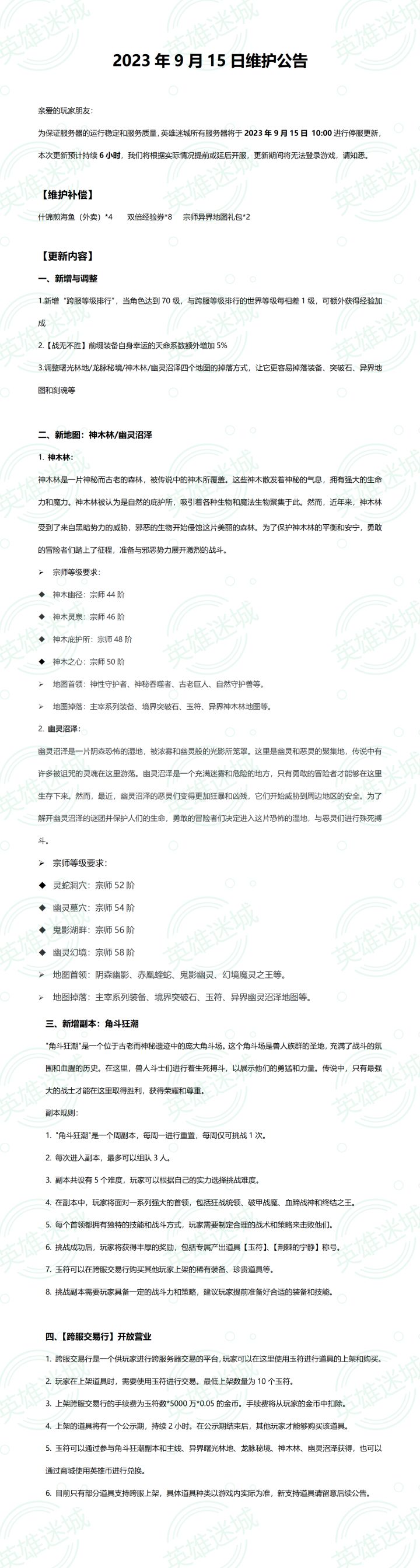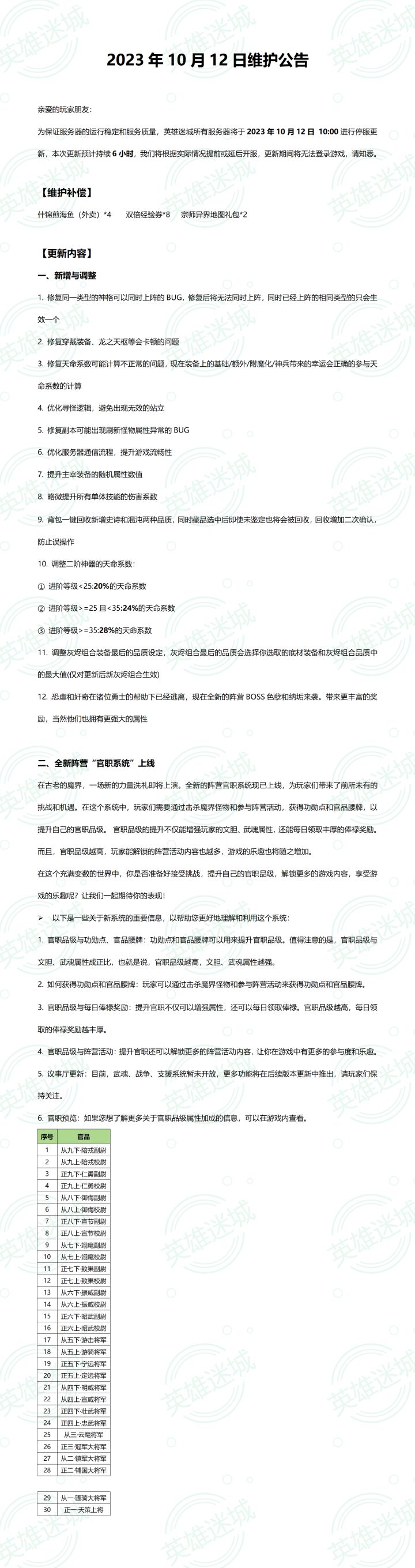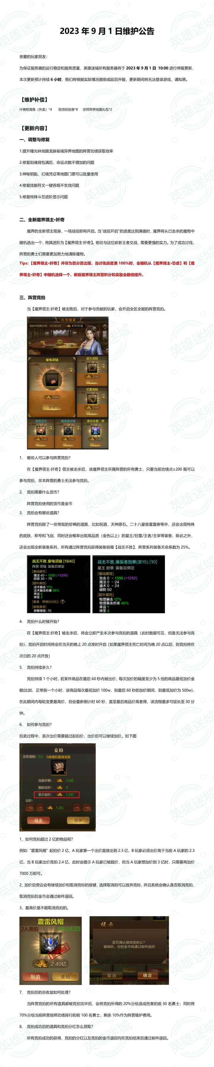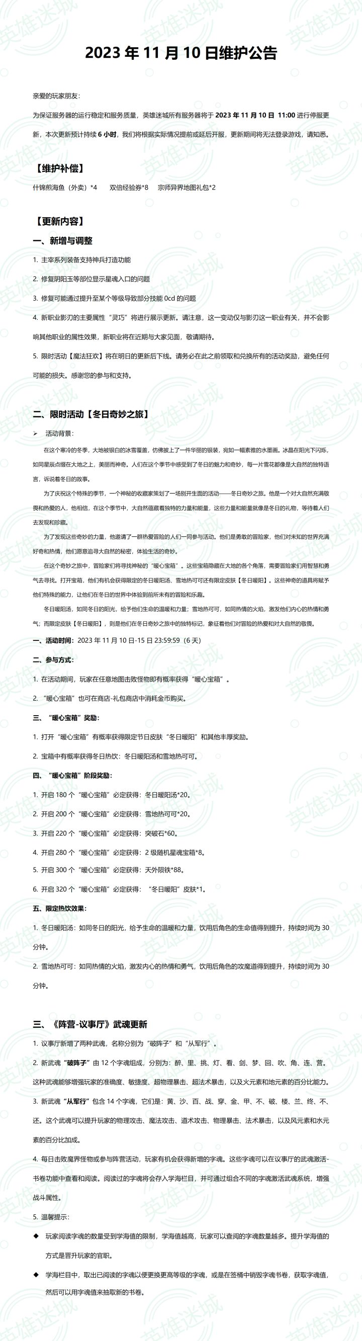 2023年10月7日维护公告亲爱的玩家朋友:为保证服务器的运行稳定和服务质量,英雄迷城所有服务器将于2023年10月7日 15:30进行停服更新,本次更新预计持续1小时,我们将根据实际情况提前或延后开服,更新期间将无法登录游戏,请知悉。以下是本次维护的更新内容,请您仔细阅读以便更好地参与游戏:1. 星魂的凹槽重置功能升级,新增自动重置到指定孔位的功能,您可以手动设置开启这个功能。2. 从曙光林地开始,主线地图和异界地图现在会掉落更多神兵材料,包括拓印和打造书。3. 对于神话金币宝箱(兑换路径:璀璨中华-音律商店-玉符商城)等类型的道具,现在新增了批量开启的功能,让你更便捷地打开多个宝箱。4. 请注意,“璀璨中华”活动中的“以文会友”、“琴音共鸣”、“音律商店”、“财富大亨”活动的结束时间是2023年10月7日23时59分59秒(包括兑换时间)。请及时领取和兑换相关道具,以免造成损失。5. “璀璨中华”活动中的“好运连连刮刮乐”活动将会延迟到下次更新。如果您的刮刮乐还未刮满,您仍然可以继续参与活动。感谢您的理解和支持,祝您游戏愉快!