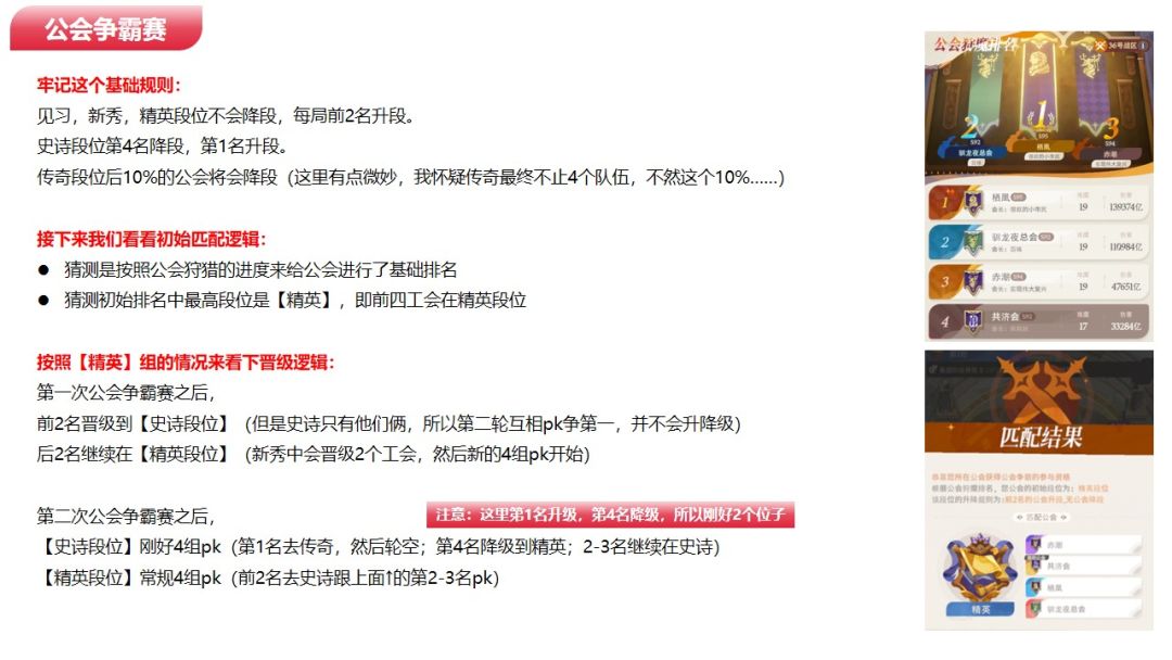 宝子们好,刚更新了测试玩法【公会争霸战】 抽空摸了个规则解读和奖励分析期待[表情_期待]一起来看看吧 举手[表情_举手]牢记这个基础规则: 见习,新秀,精英段位不会降段,每局前2名升段。 史诗段位第4名降段,第1名升段。 传奇段位后10%的公会将会降段(这里有点微妙,我怀疑传奇最终不止4个队伍,不然这个10%……) 思考[表情_思考]接下来我们看看初始匹配逻辑: 猜测是按照公会狩猎的进度来给公会进
